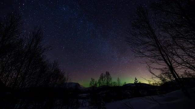 Time lapse of a night scene with stars over the winter landscape.