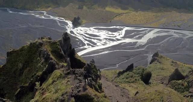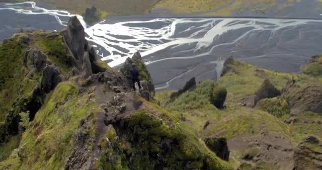 > Aerial shot of man walking on a cliff in Iceland