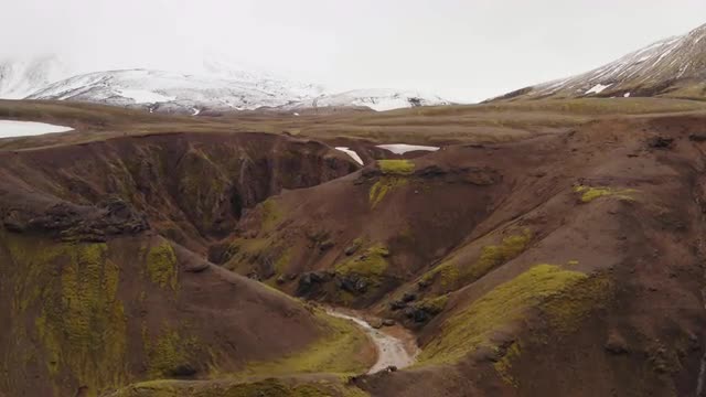 Aerial drone shot of a man standing on a mountain ridge in Landmannalaugar during sunrise, Highlands of Iceland