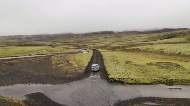 Aerial drone shot of SUV crossing a river ford in Highlands of Iceland