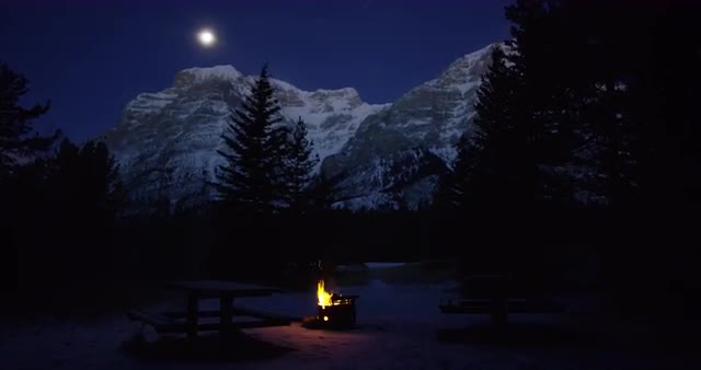 > Push Towards a Campfire with a Beautiful Mountain Range in Banff
