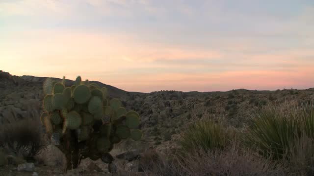 A timelapse of a sunset casting subtle orange and yellow color in the sky behind the iconic distorted trees of Joshua Tree National Park in California. The sky slowly fades to black.