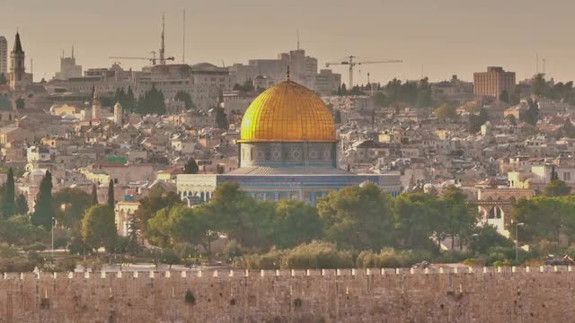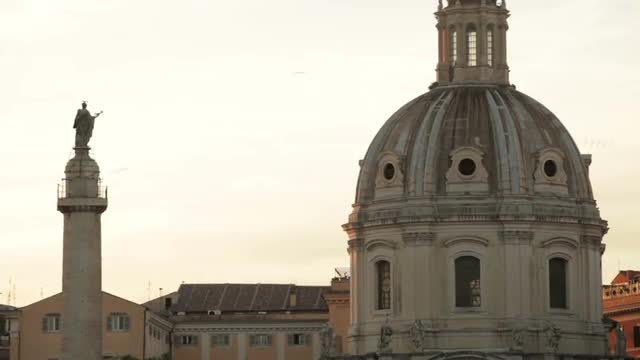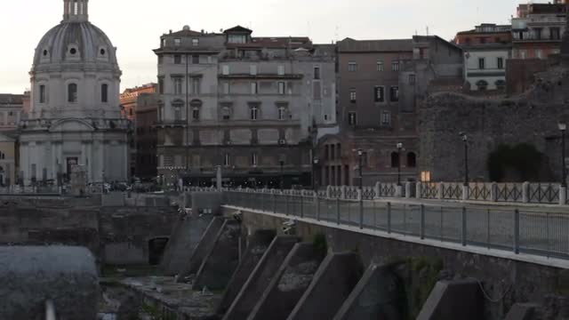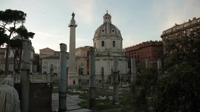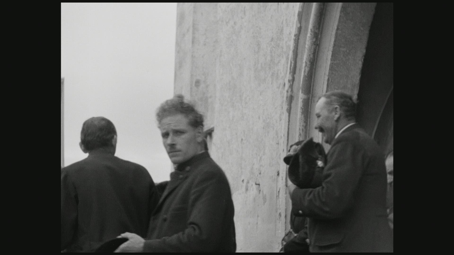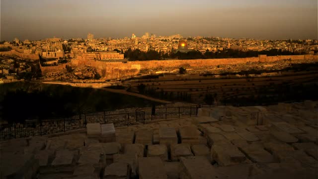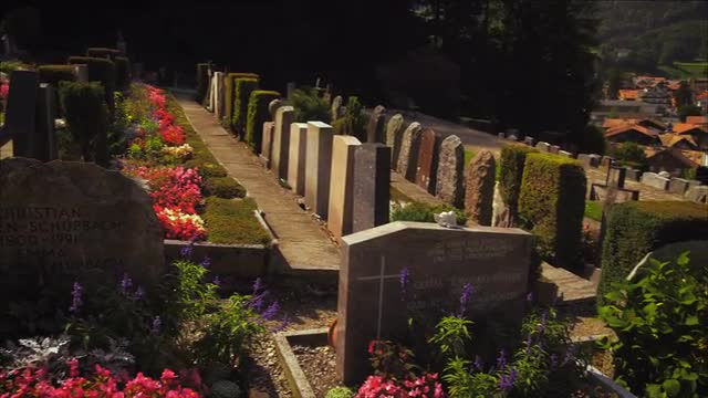 A tracking aerial drone shot looking down over rows of graves in a church yard.