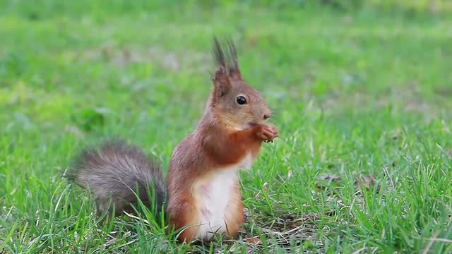 Close up shot of a grey squirrel sat on top of a rock with a pine cone in a woodland area.