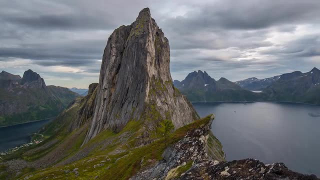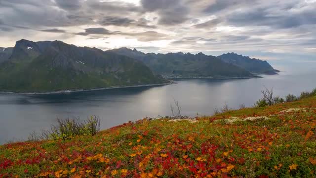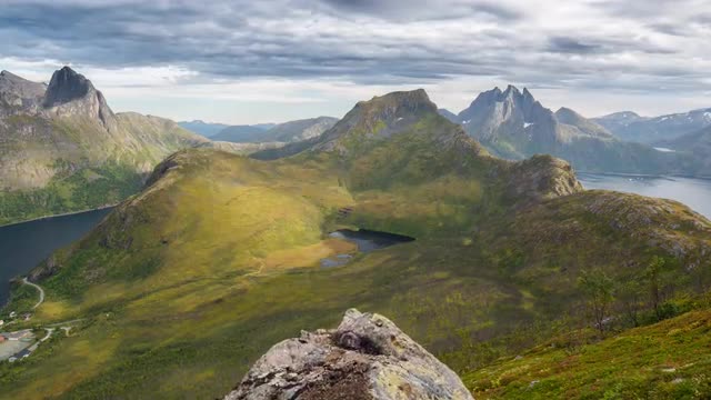 Time lapse of sunset over Senja island, Mount Segla and fjords as seen from Mount Keipen