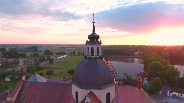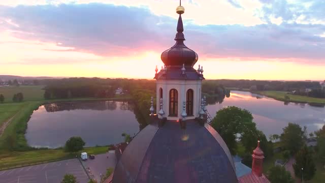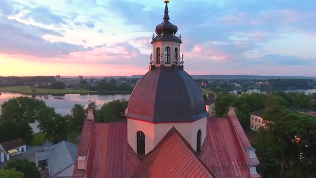Flying over Valencia at sunset, Spain. Cityscape with bridge and buildings