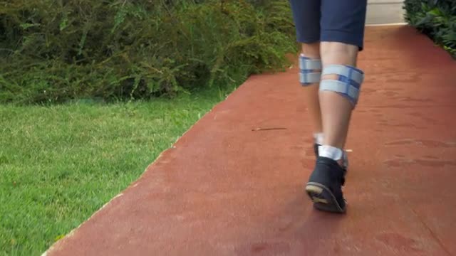 1033810 - FES treatment. Boy with foot drop system walking indoor