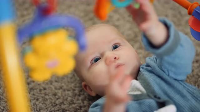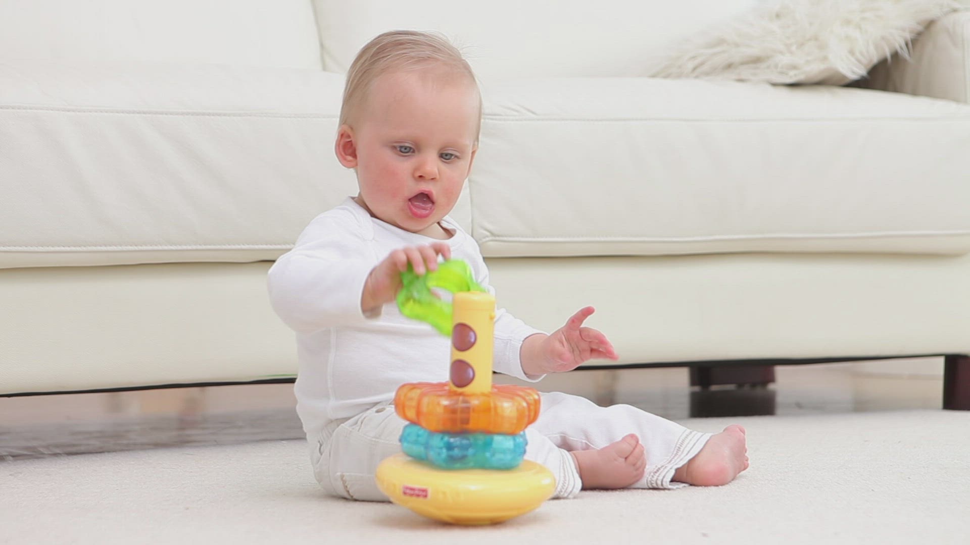 Close up shot of an adorable baby girl in gray clothes playing on the carpet of her living room at home