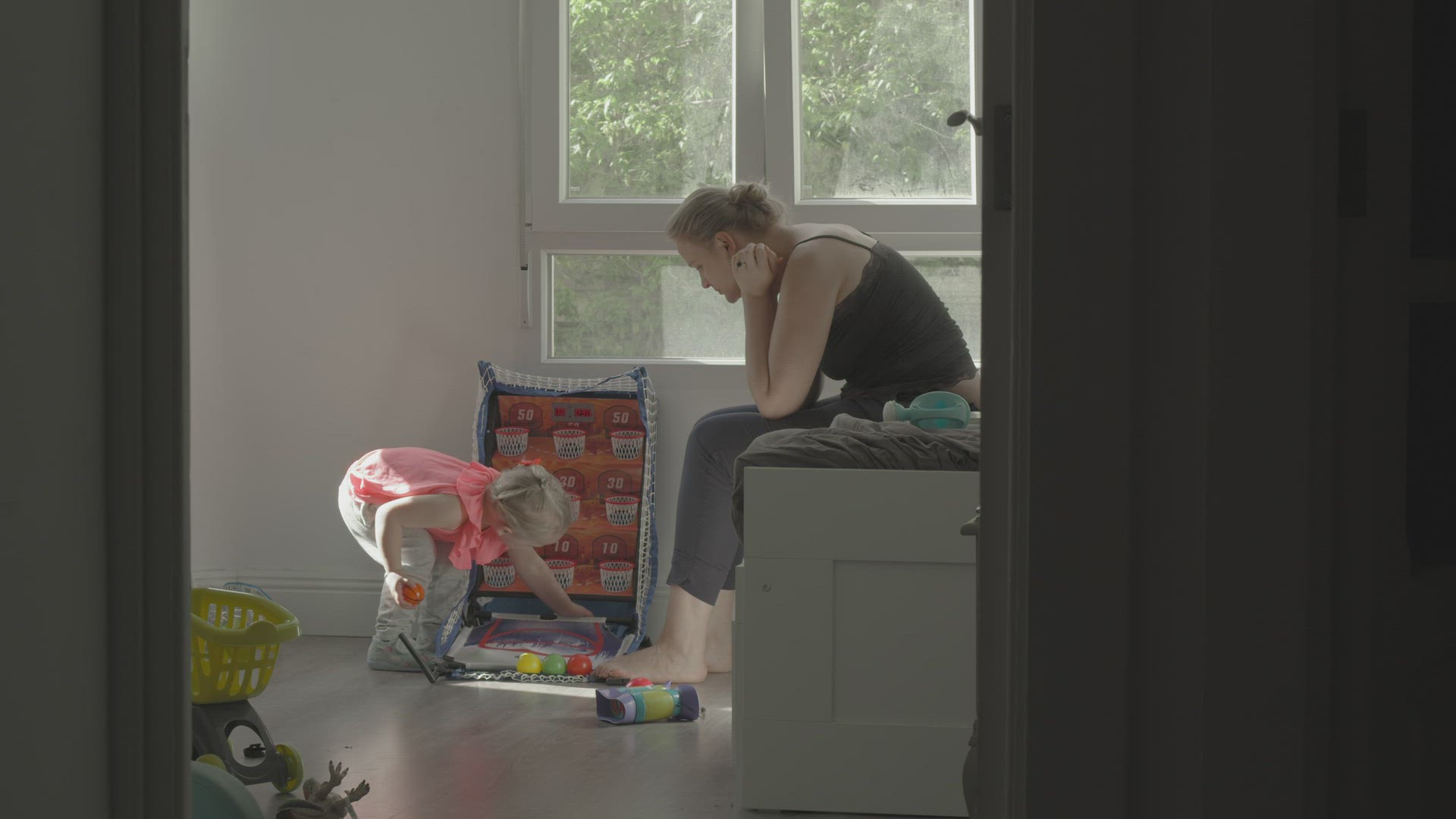 Mother holding five months old baby girl on gymnastic ball. Doing exercises with child