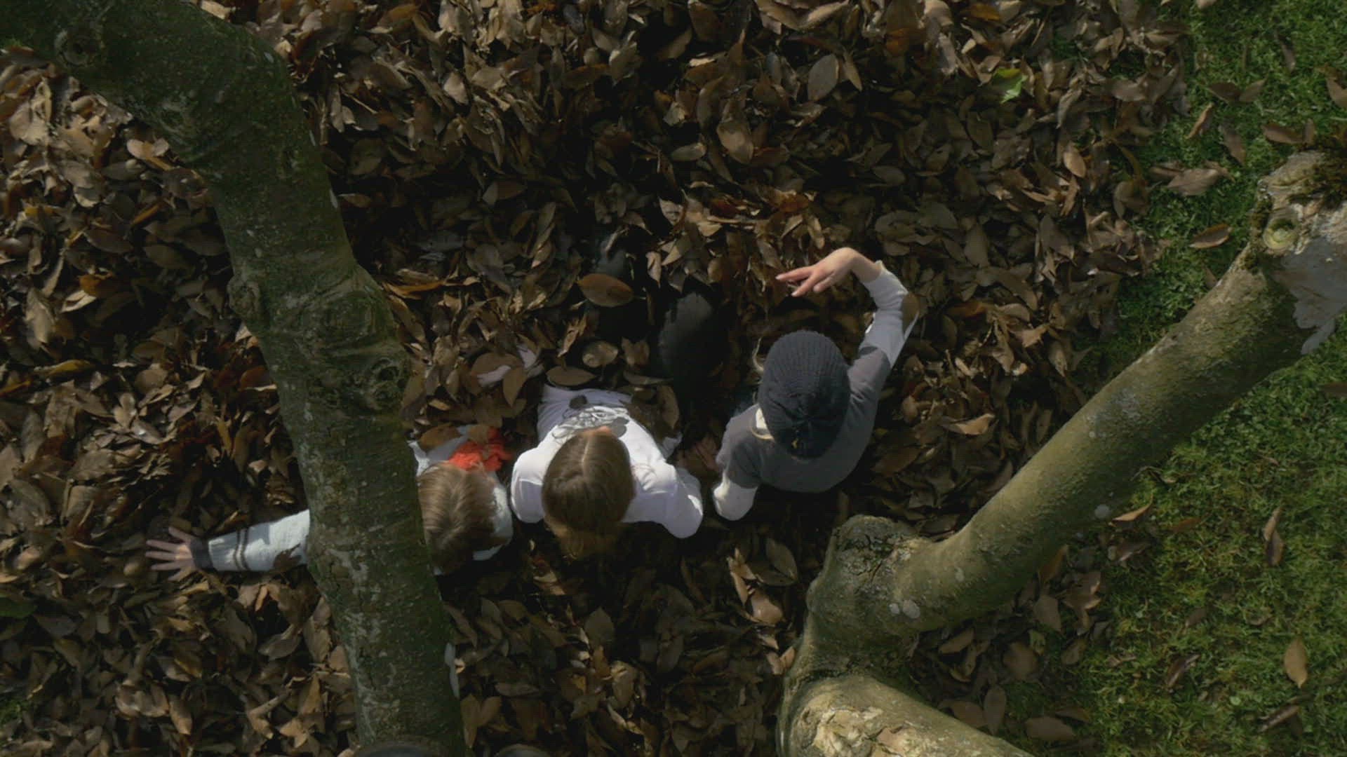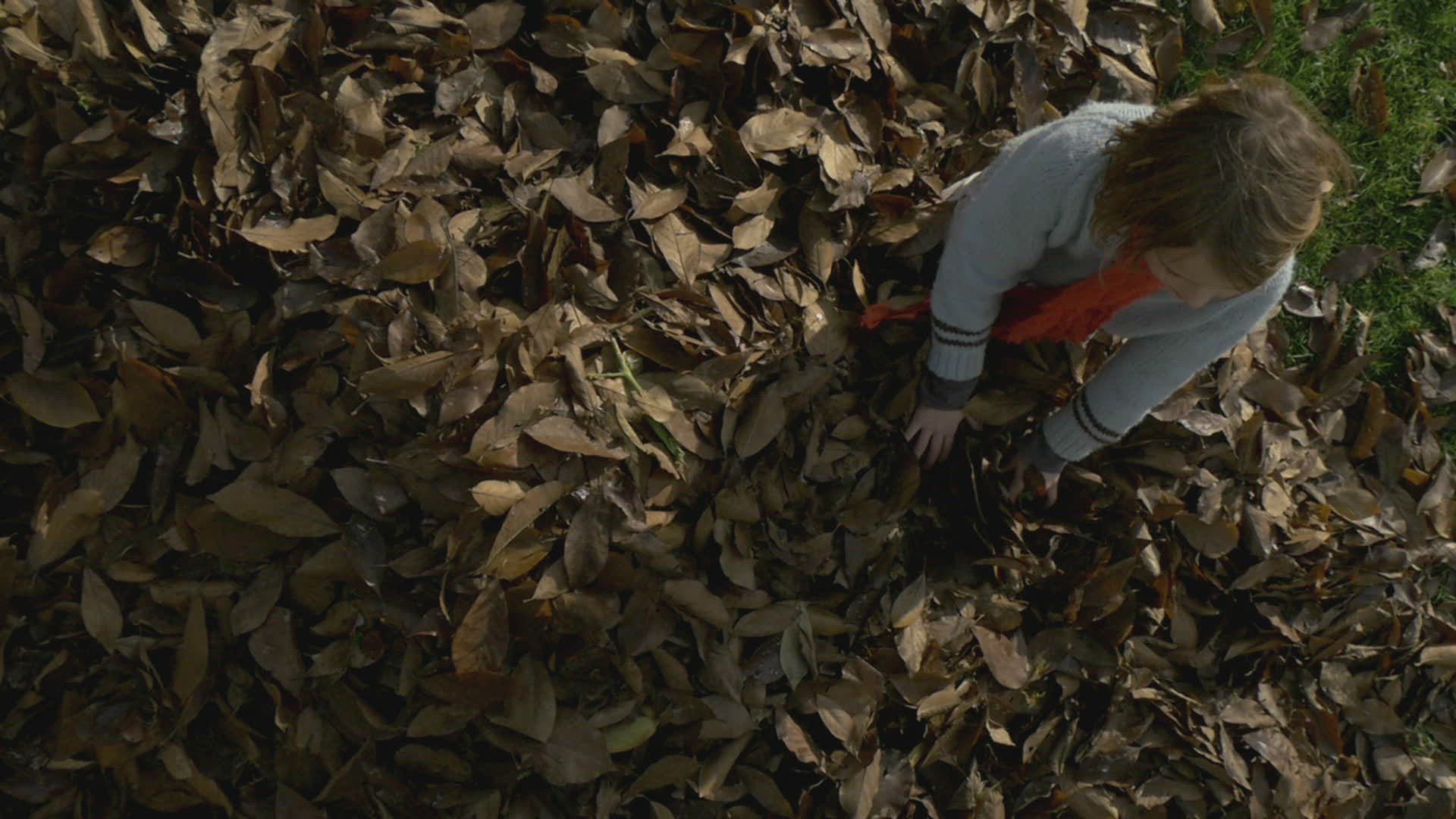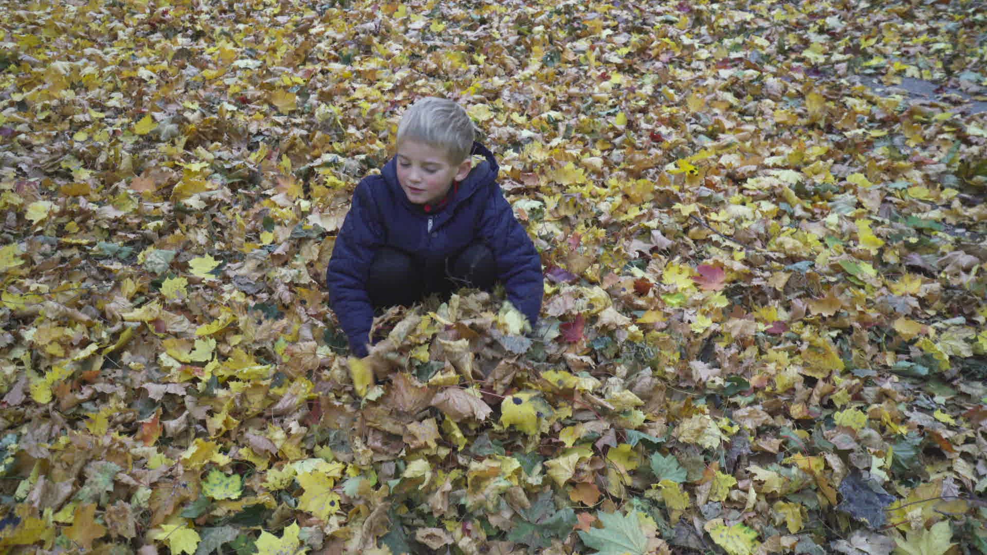 Slow motion shot of a child walking on the grass covered with dry leaves