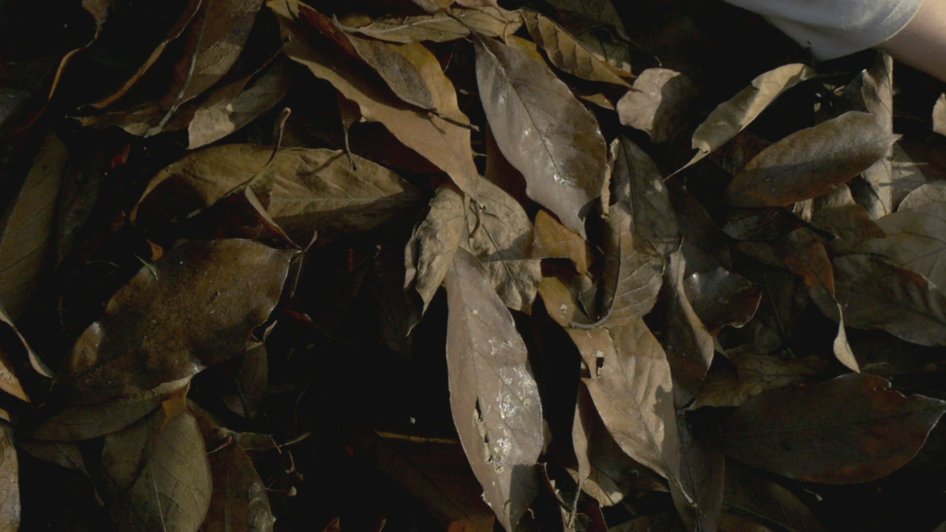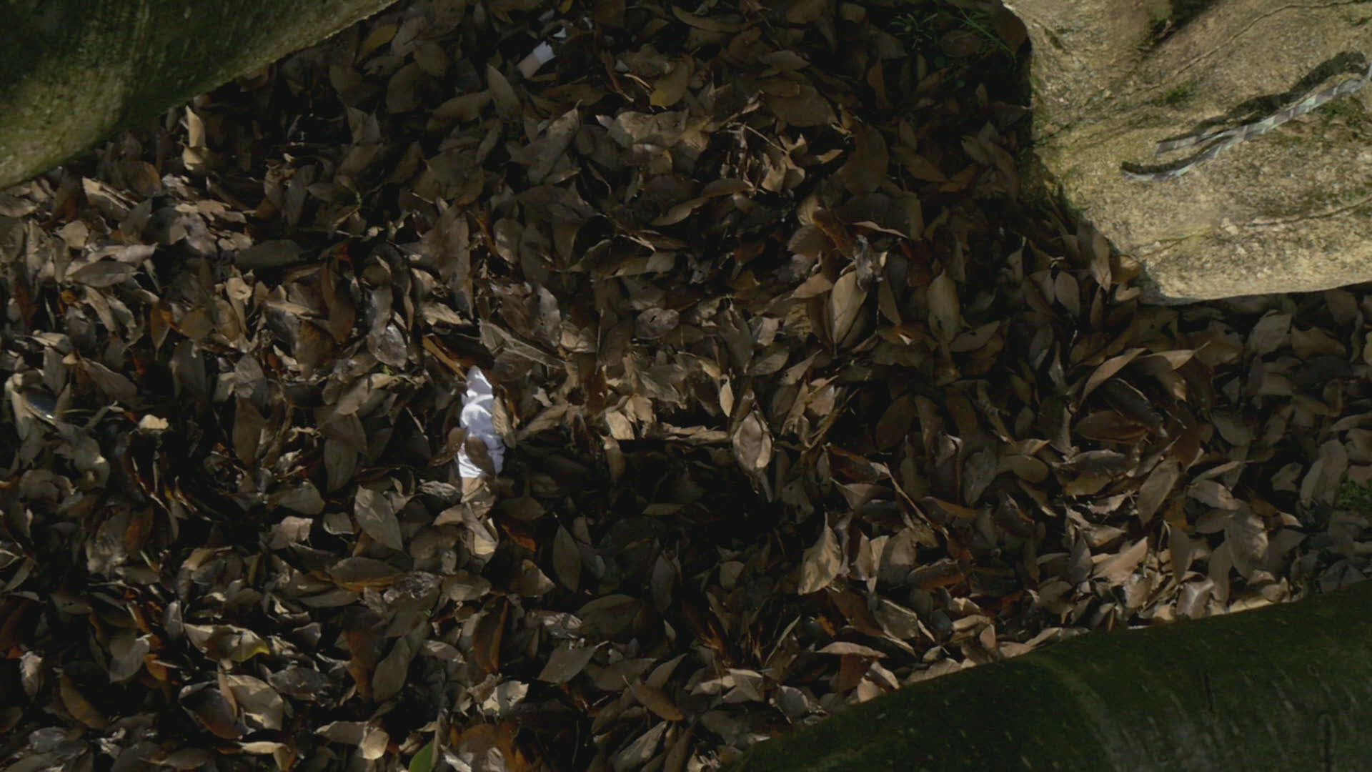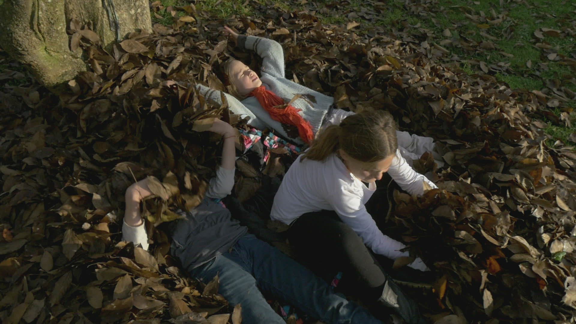Slow motion shot of a child walking on the grass covered with dry leaves