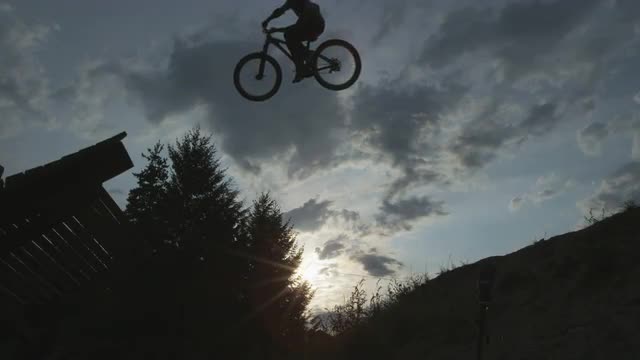 Mountain biker jumping of a ramp doing a tail whip 360.