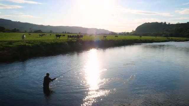 Close up of man fly fishing in slow motion