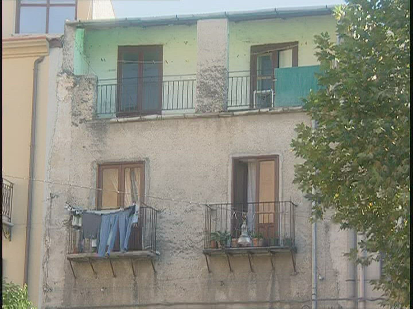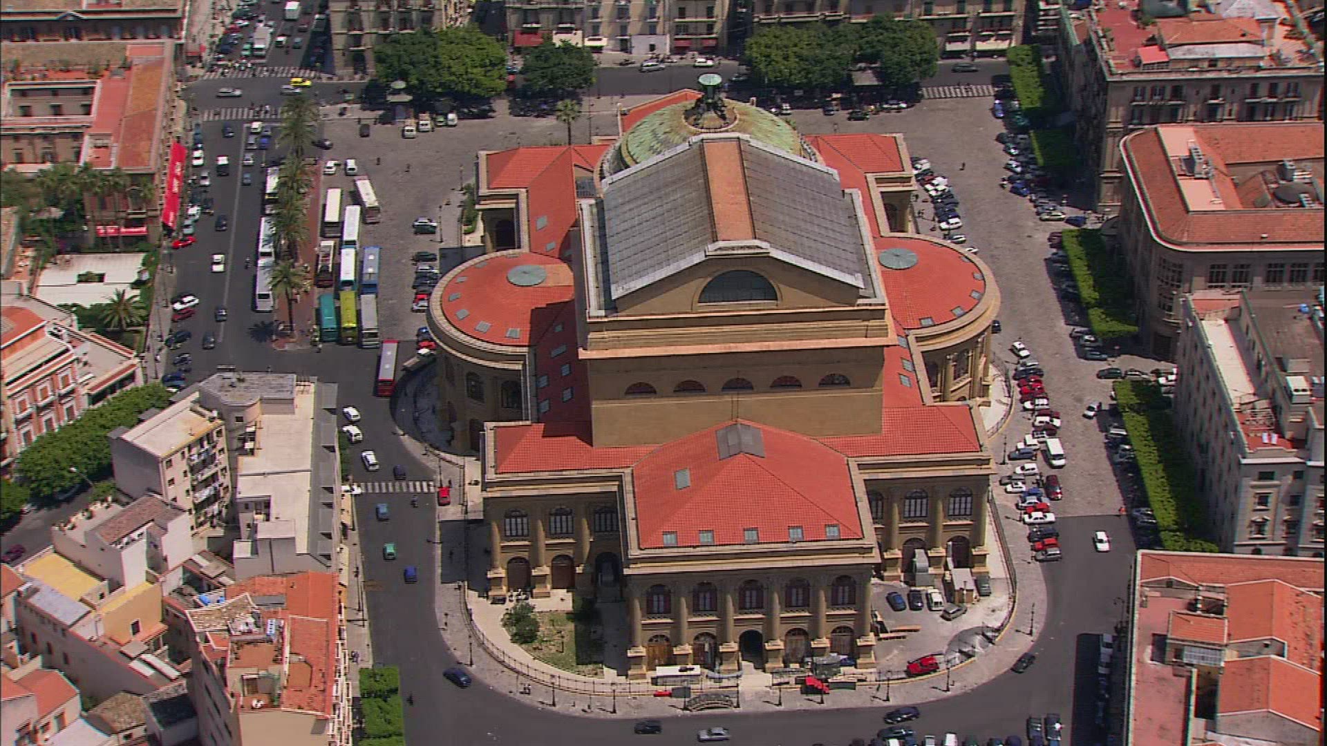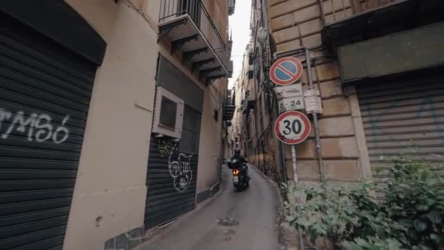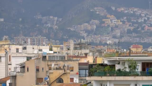 Panning shot of Palermo, Italy. Cityscape with typical houses in foreground and built-up green hills in background