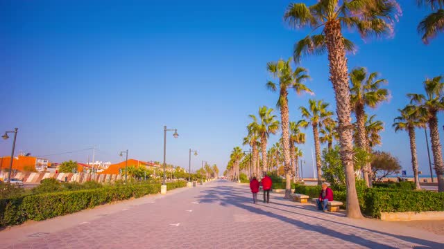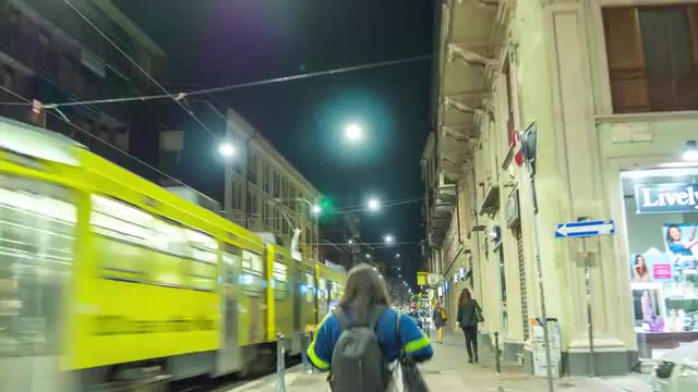 VALENCIA, SPAIN - JANUARY 13, 2018: Steadicam shot of walking along the street in night city. Passing by bike sharing station, parked cars and traffic lights with green signal