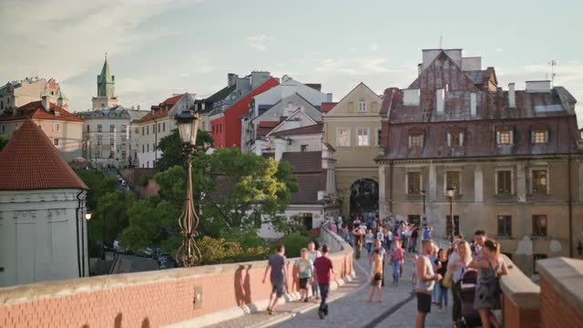 Woman with two kids walking in the city and drinking coffee