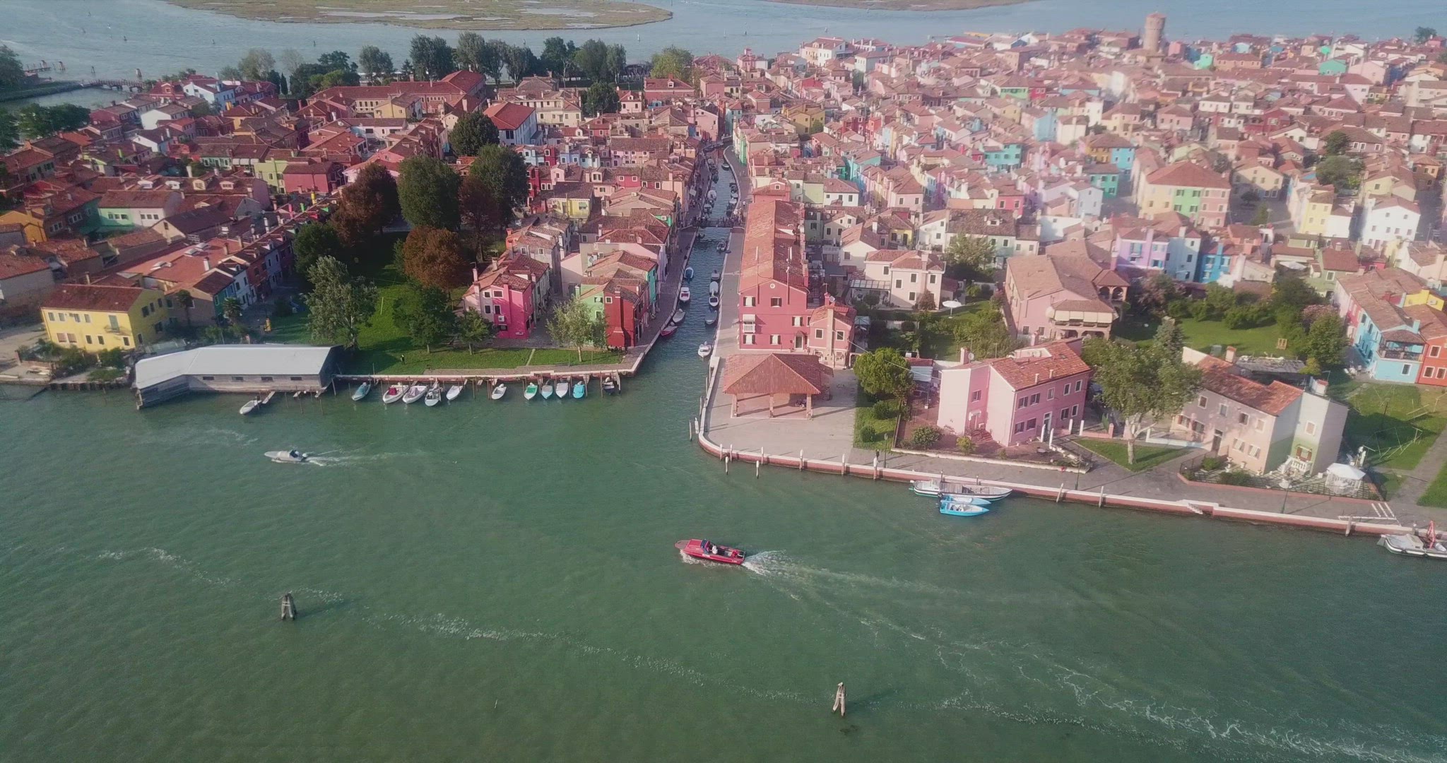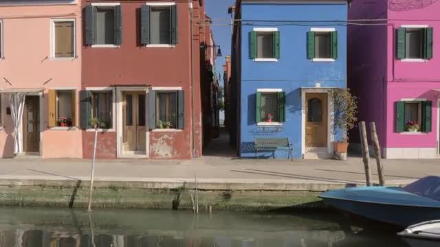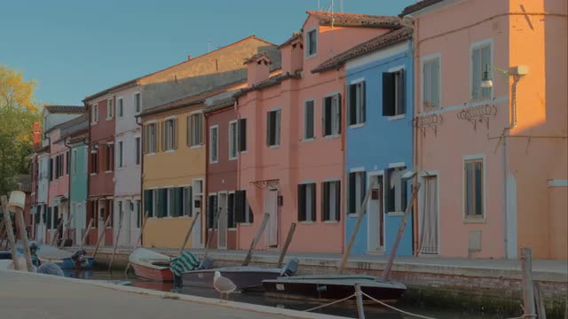 BURANO, ITALY - APRIL 21, 2018: Townscape with canal and moored boats alongside the street with painted houses. Evening scene with the tower of San Martino Church