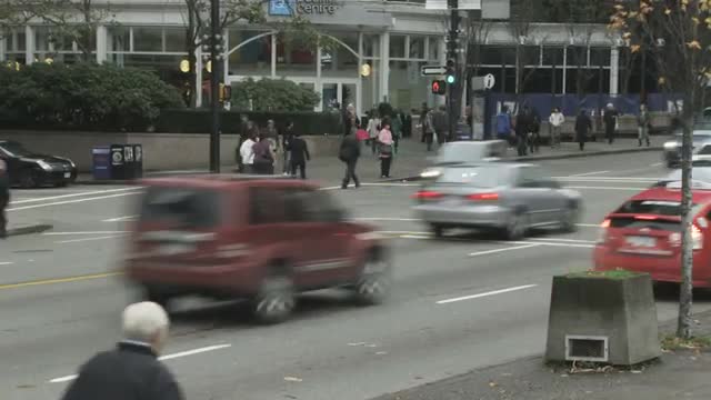 Cars and people walking and driving downtown