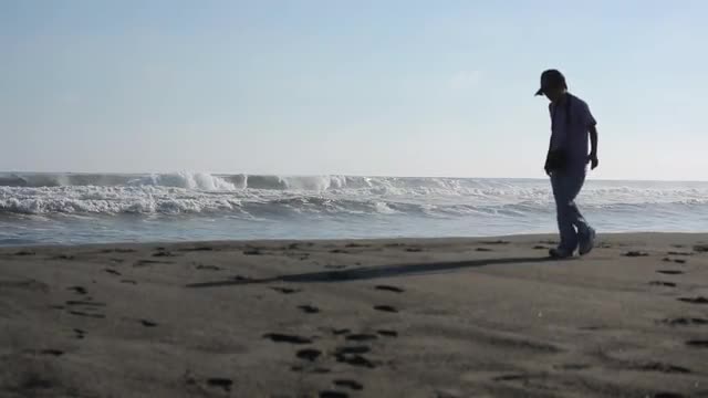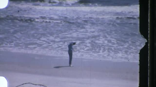 8mm Film scanned at 16:9 1920x1080. Isolated person walking on a Florida Beach, circa 1960.
