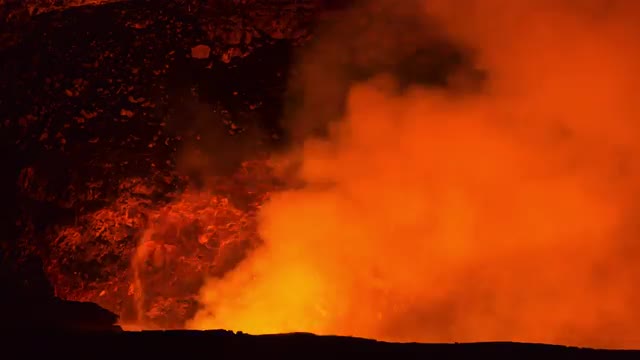 Two beautiful rainbows form over a lava spout in Kilauea Volcano at Hawaii Volcanoes National Park
