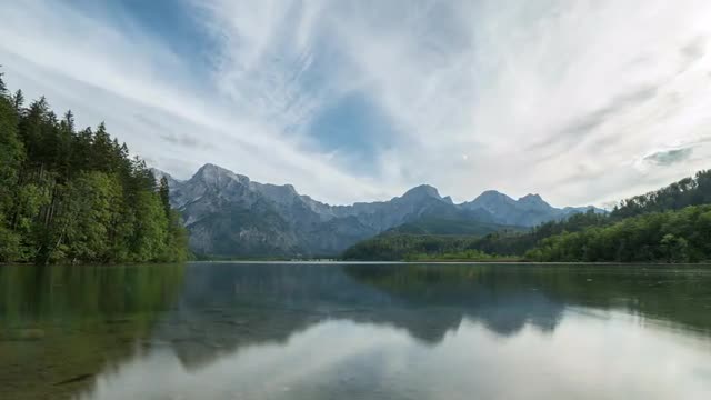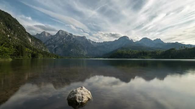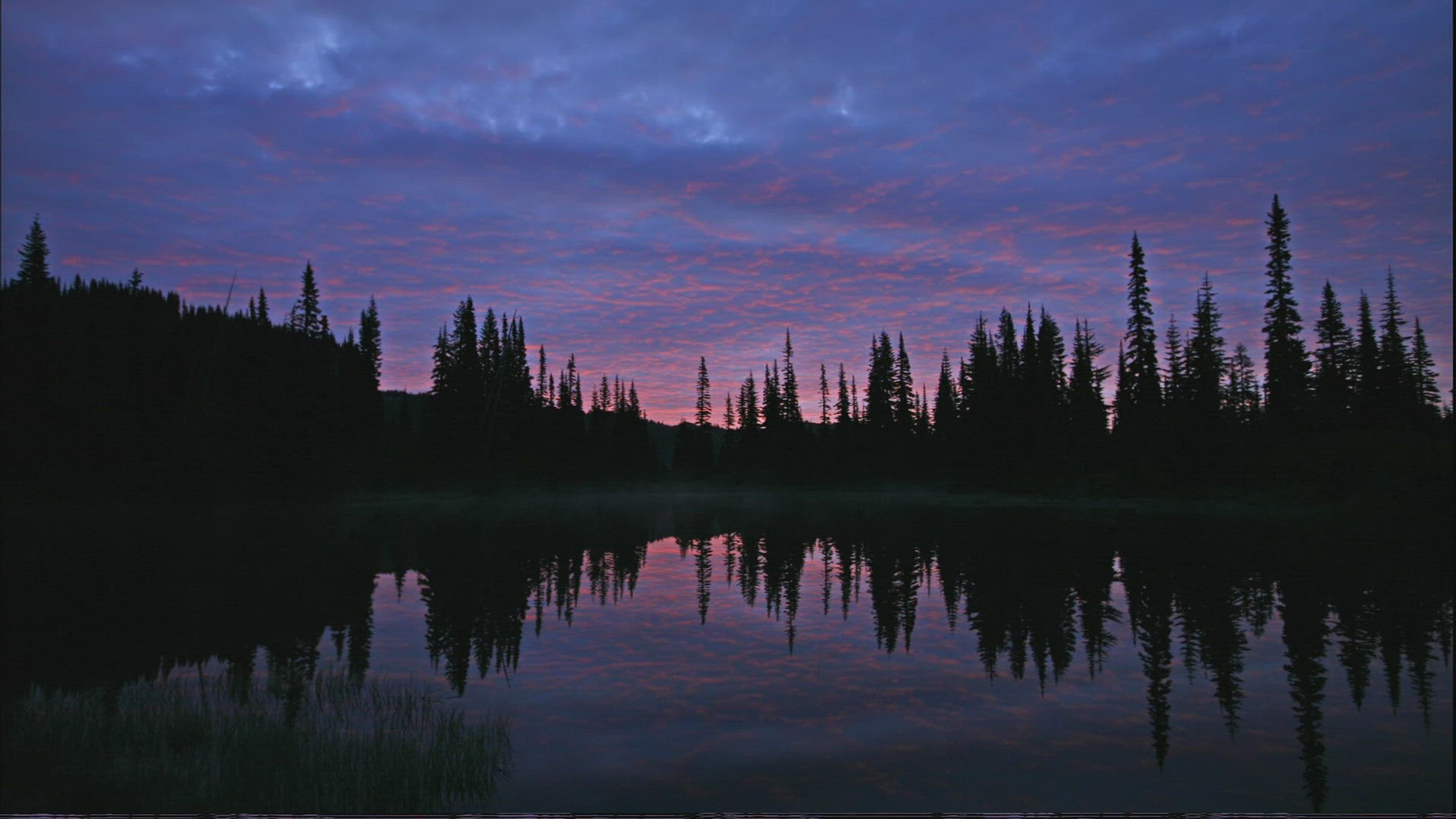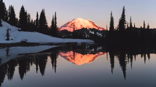 Mount Rainier reflects in a small lake during a beautiful, colorful sunrise. Shot at a glacier tarn during the summer.