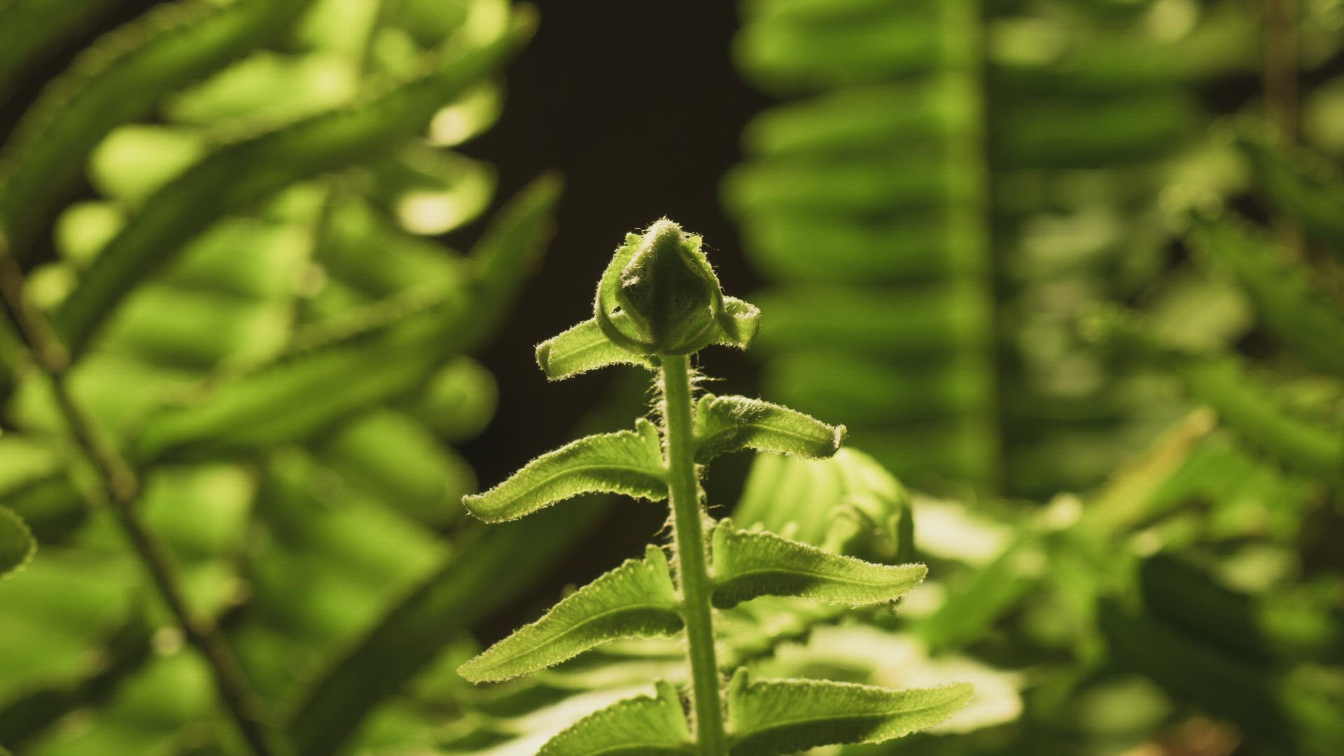 Asplenium nidus, the birds nest fern, common is Asia, opening with vivid greens. Camera follow ferl.