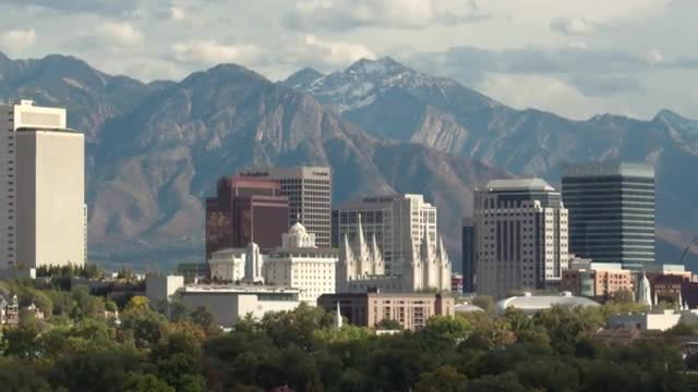 > Aerial flying towards downtown Salt Lake City past Capitol Building