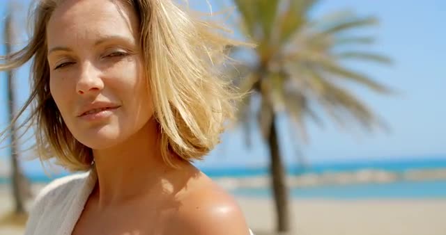 402678 - Woman with Hand in Hair on Beach Looking to Side