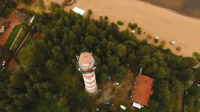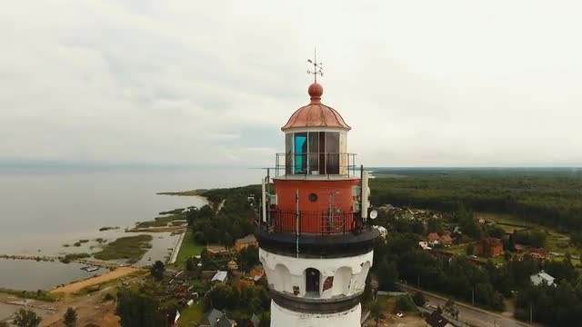 Aerial view of lighthouse beam in process in small village near sea