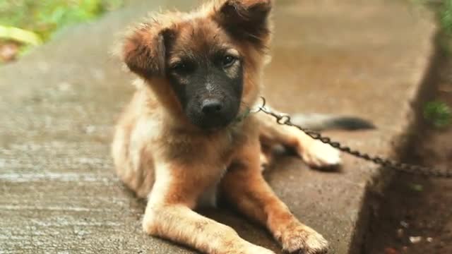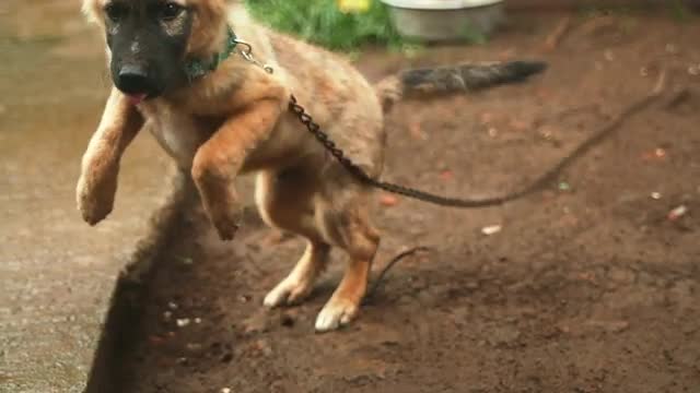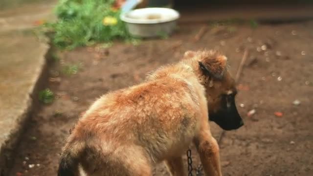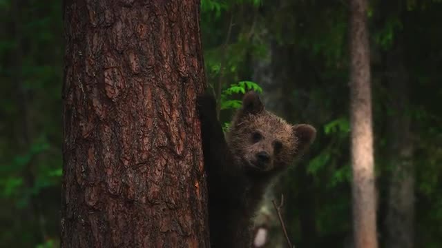 A curious baby bear cub invistigates a tree and then runs off with his sibilings
