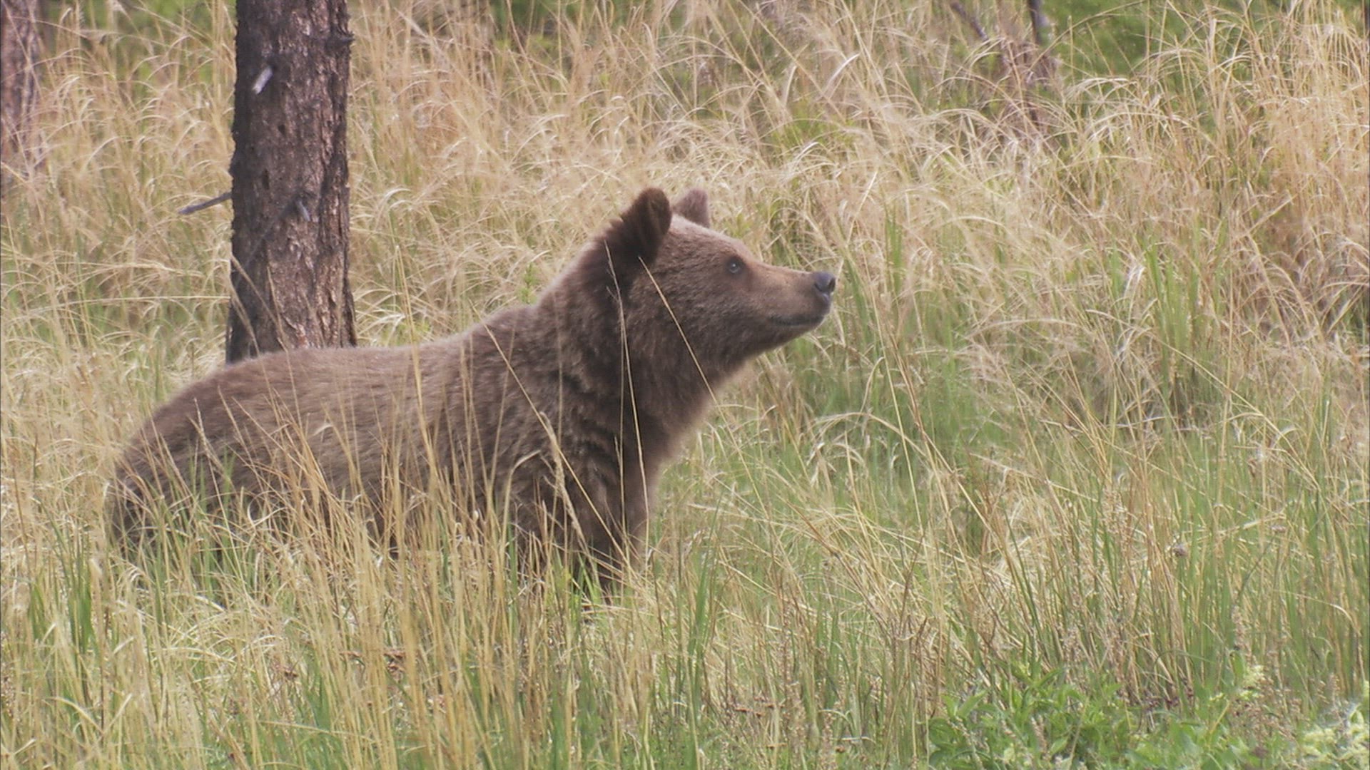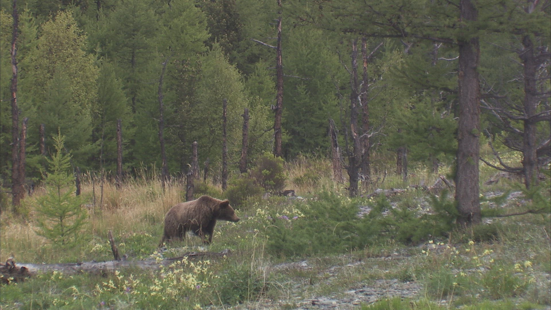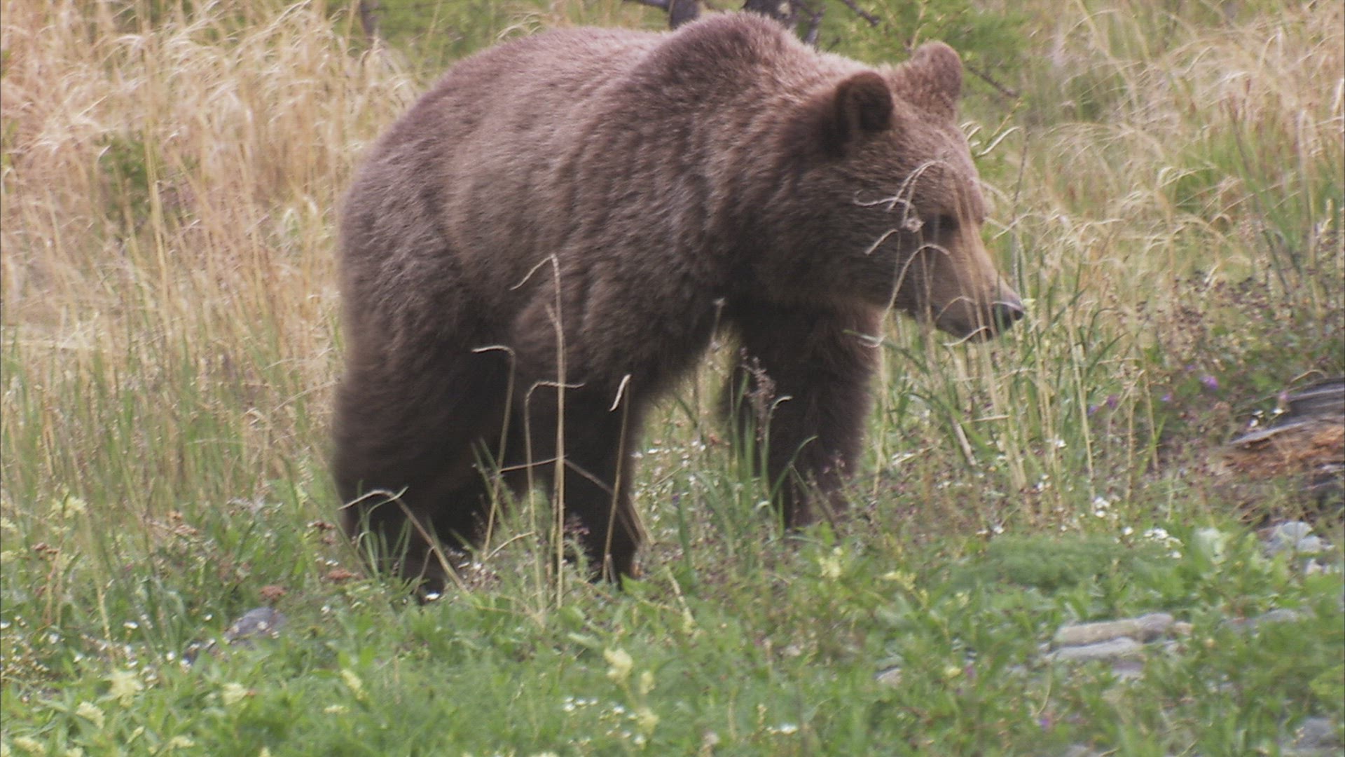 An adolescent brown bear walks through a green grass meadow with some wildflowers.