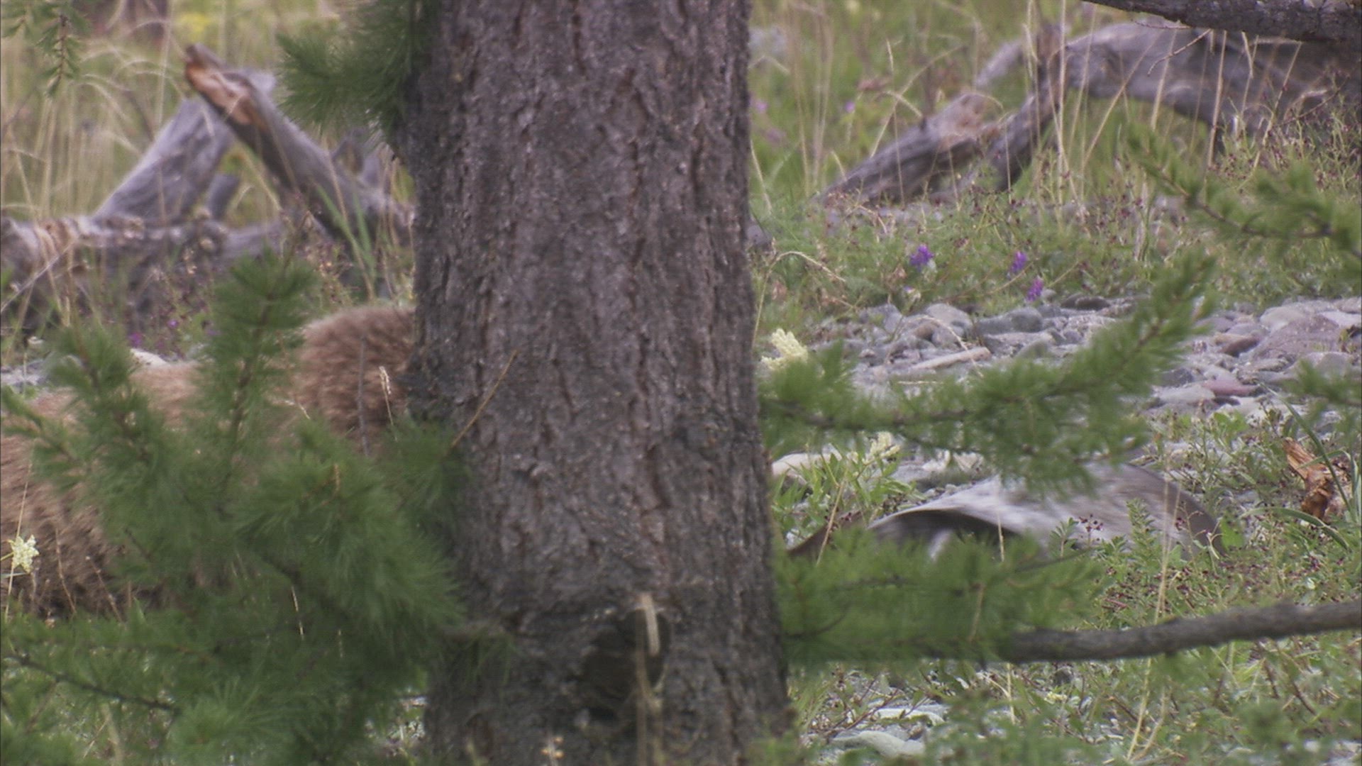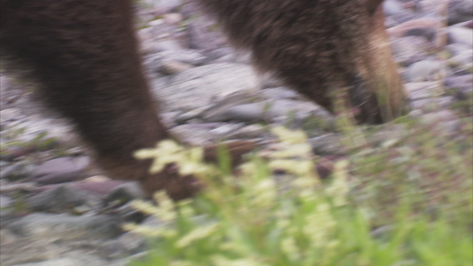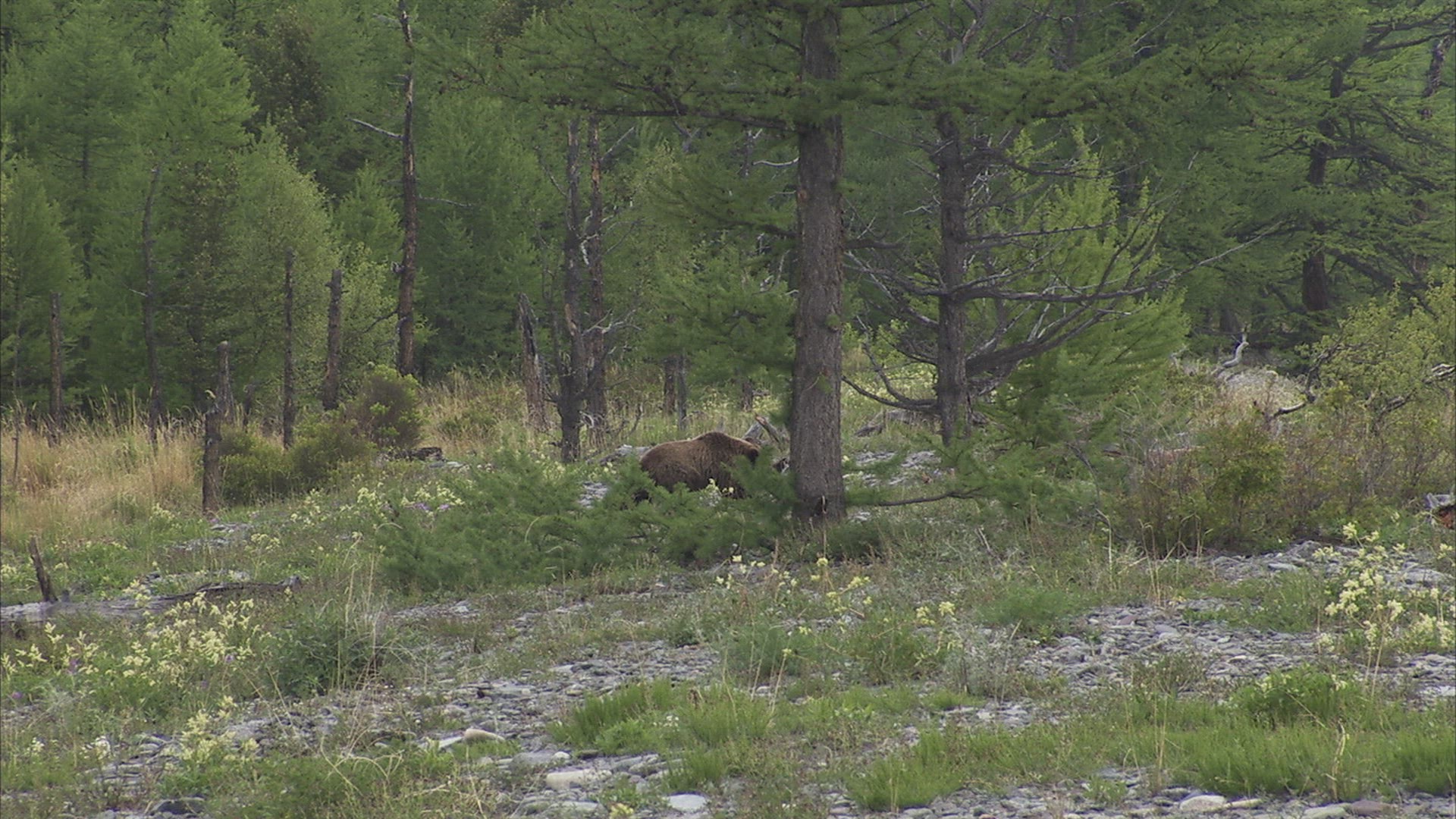 An adolescent brown bear walks through a green grass meadow with some wildflowers.