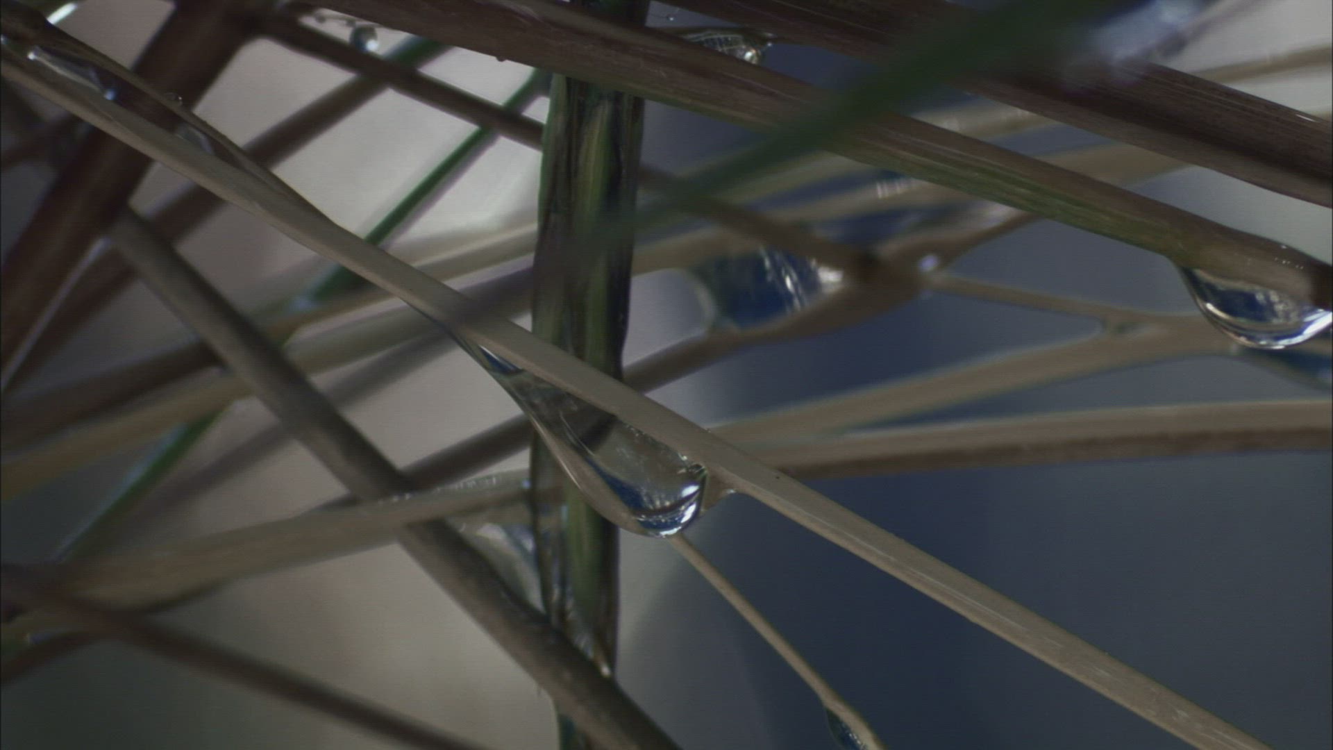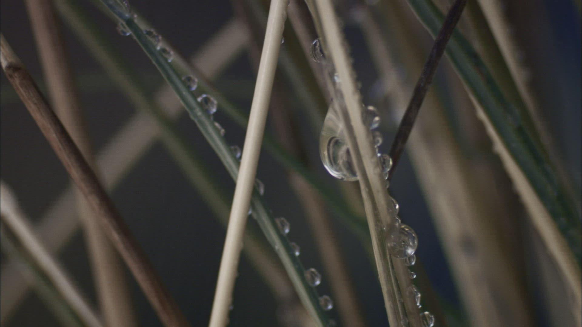 Macro video of a bead of water slowly slides down a blade of green grass after rainfall in the Pacific Northwest
