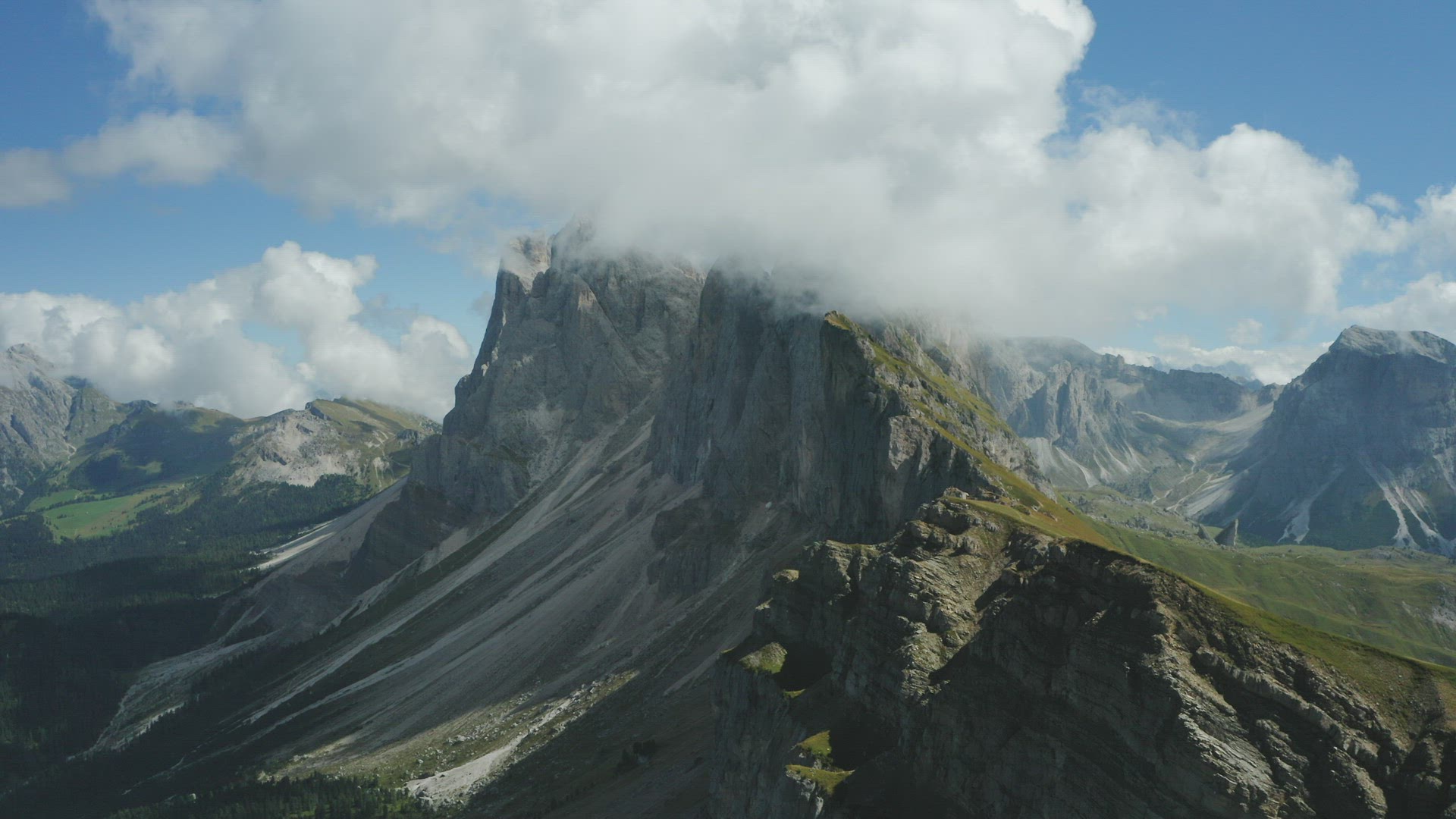 Timelapse footage of fog drifting around the tips of a mountain peak in the Italian Dolomites