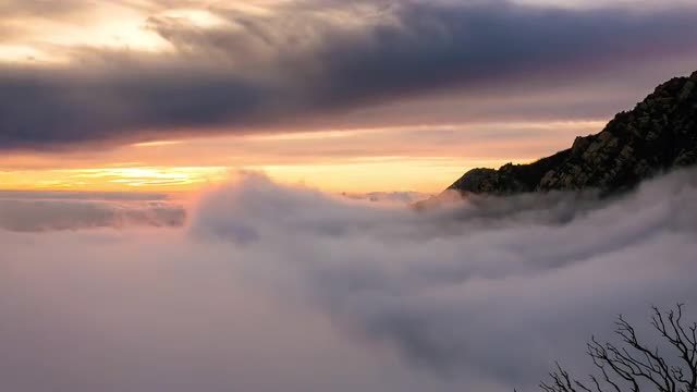 Mountain landscape timelapse footage of low fog and a colorful sunset in the Italian Dolomites