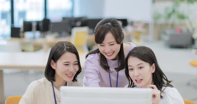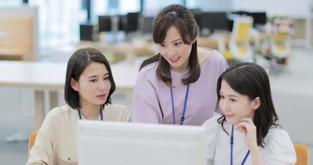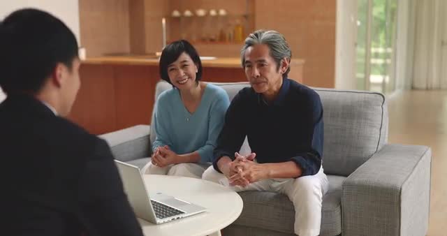 > Japanese senior couple talking with sales person in their living room