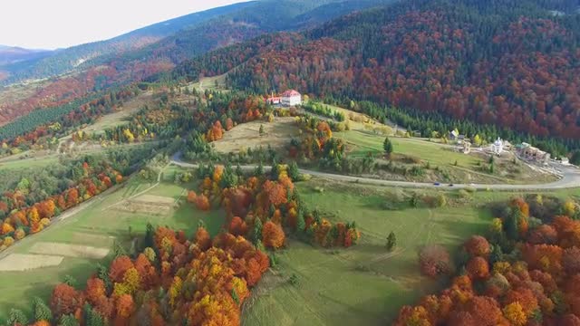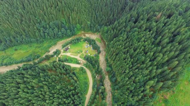 800034 - Flying over a green forest in hot air balloon busket. Handheld shot