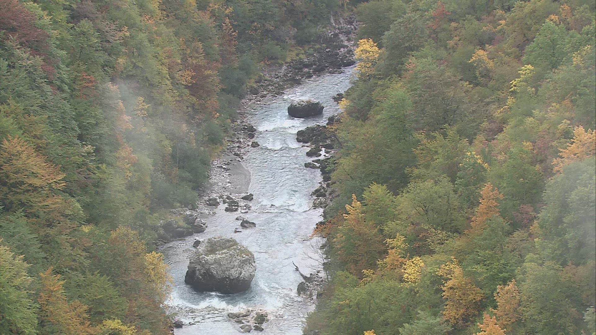 718111 - Cinematic Slow Motion Aerial Dolly of Raging Canyon River with Misty White Water Rapids
