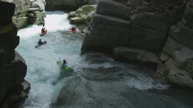 > Four Kayakers Drifting Down River