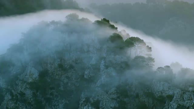 WS Clouds over forest in mountains / Pollenca, Majorca, Spain