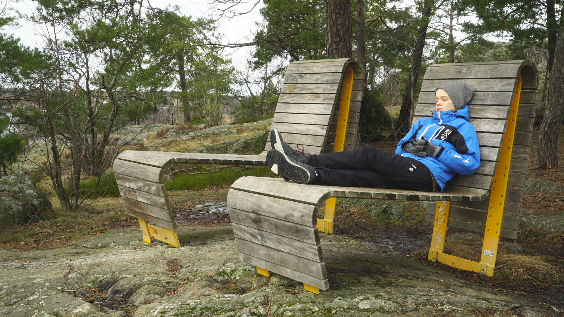 2178046 - boy resting in large outdoor chair - at viewpoint in forest