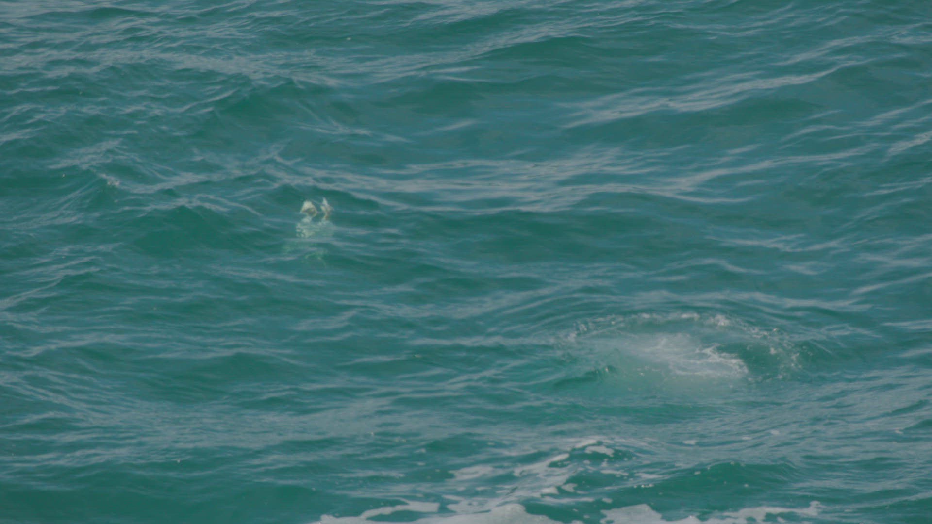 Orcas rising out of the sea with seagulls over and mountains in the background.