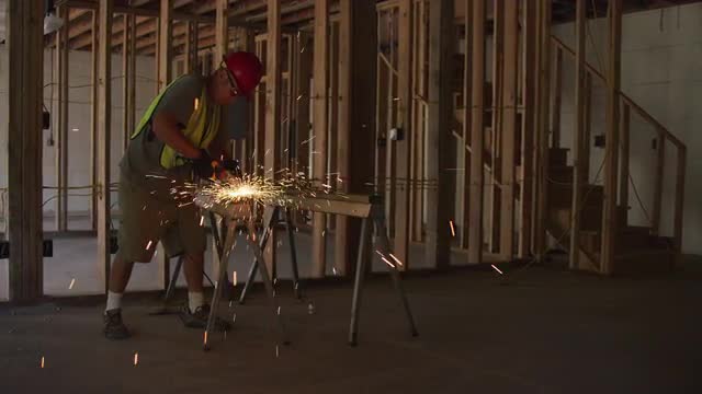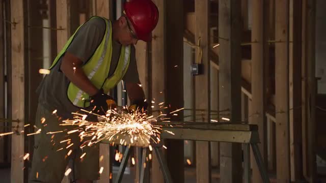 1000537 - Construction worker grinding metal and making sparks, slow motion