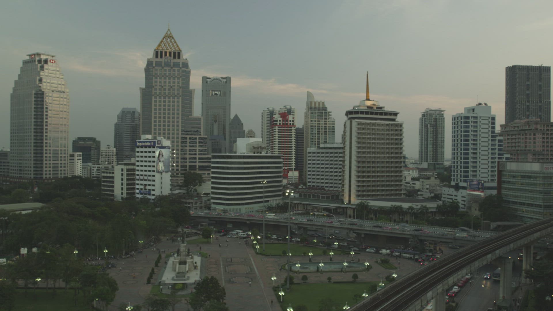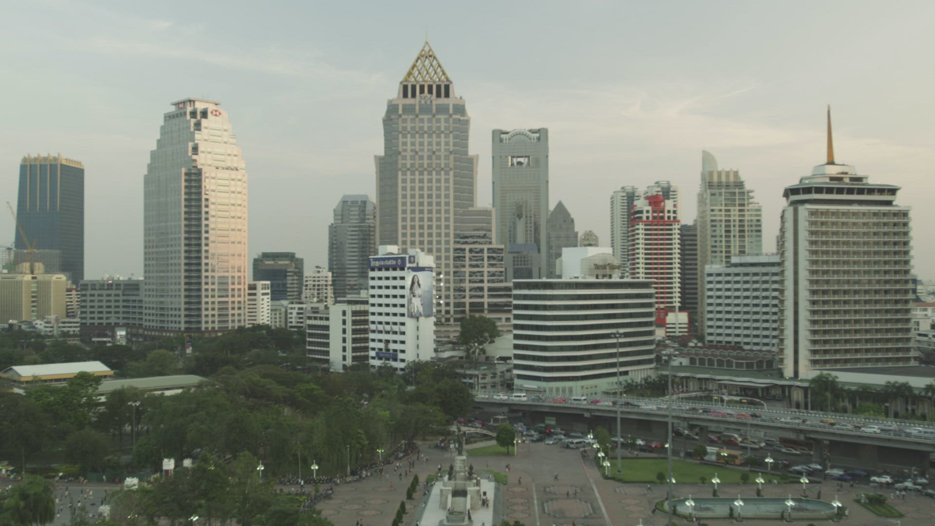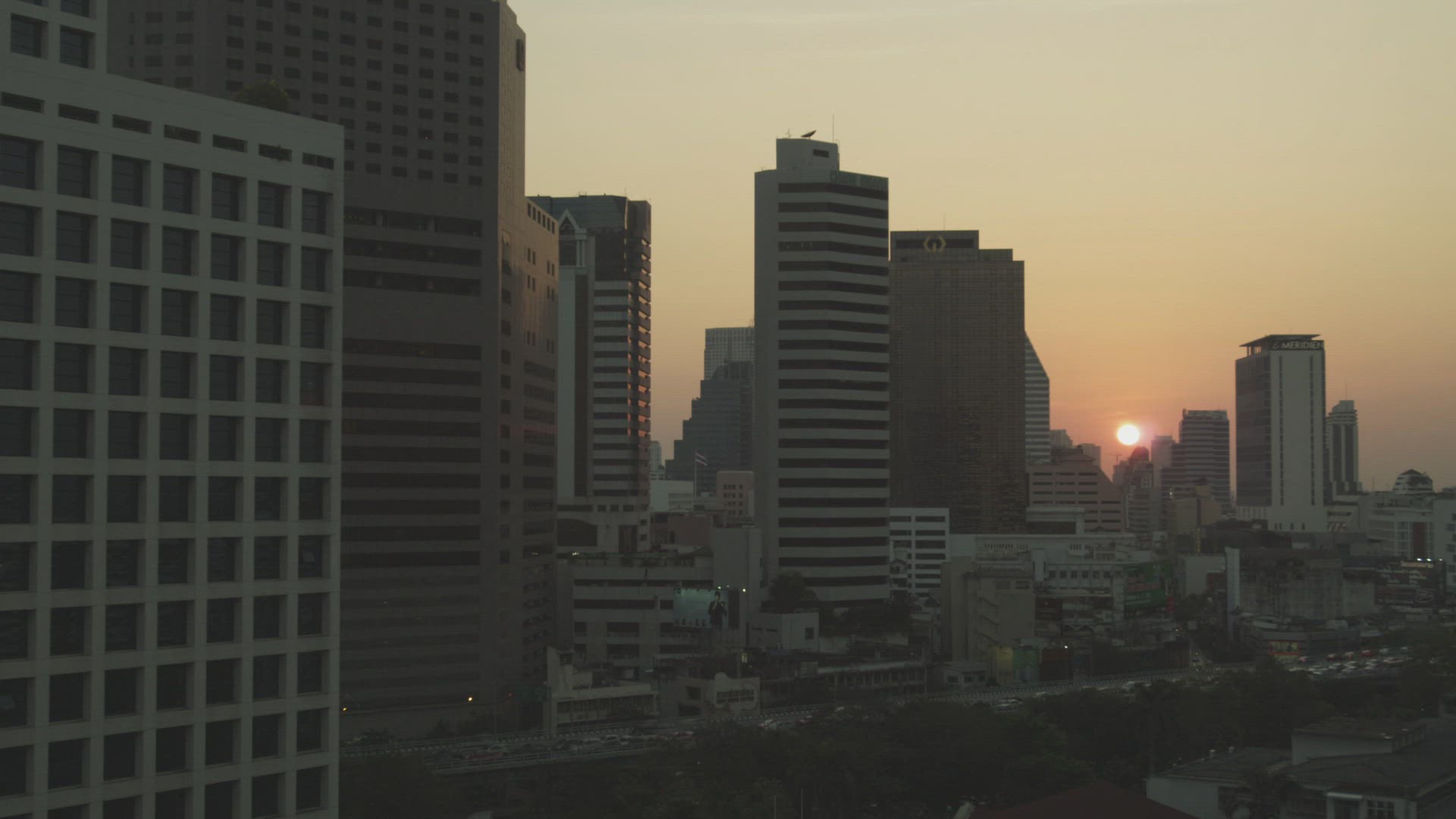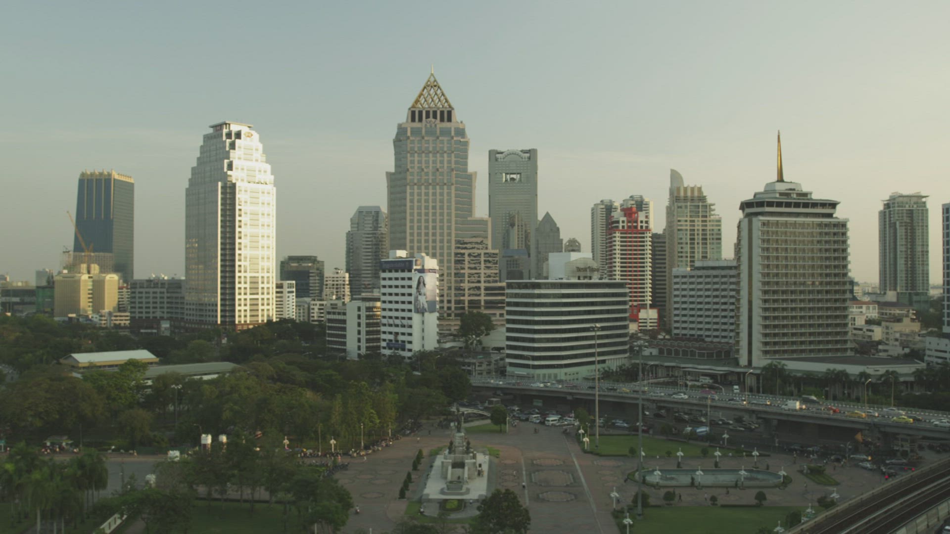 Aerial view of a city area with a busy highway and glass skyscrapers against the blue sky