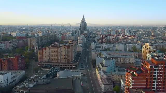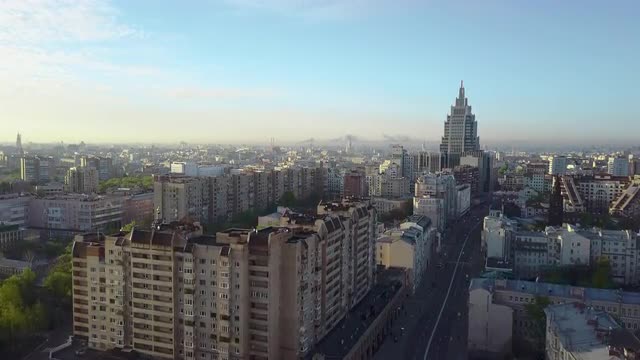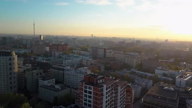 Camera rising over the city and displaying the architecture of Moscow with Ostankino Tower in morning sunlight, Russia