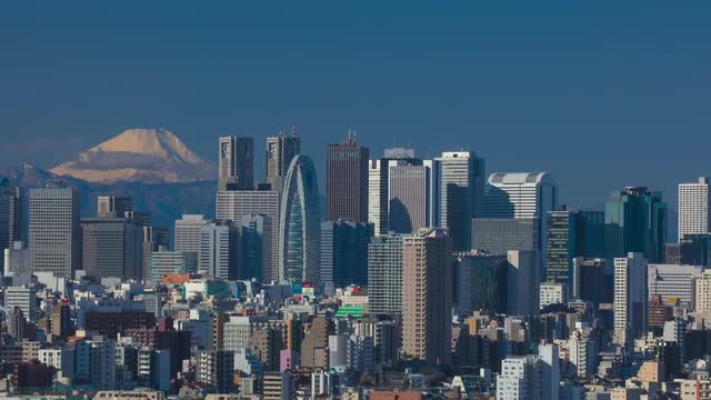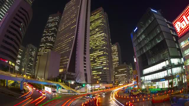 Camera vertical flight among the modern skyscrapers in the business centre of city, evening view