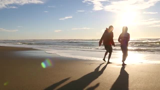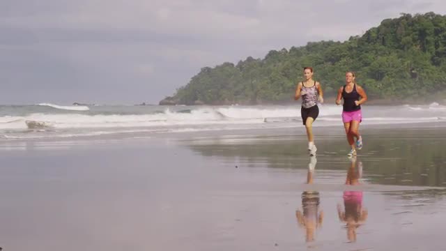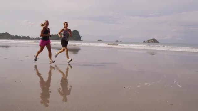 A young sporty couple running along a central Valencia street, we see them from the side