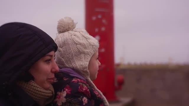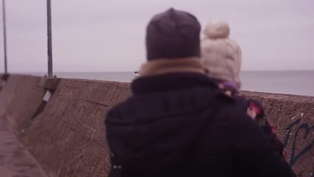 A mother holds her baby daughter in her arms, walking along the beach. The daughter amuses herself, taking the sunglasses off her mothers face
