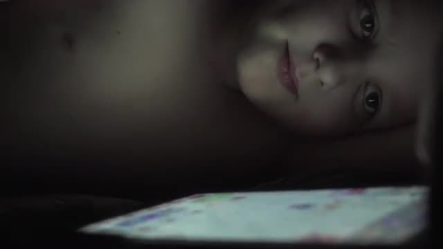 A young woman sits up in a hotel bed, while the blinds are automatically lifted and the bedroom is filling with light