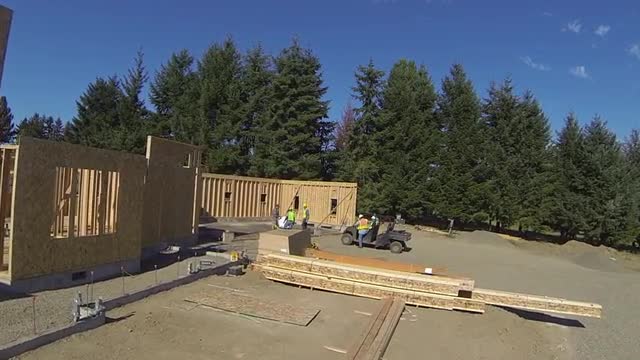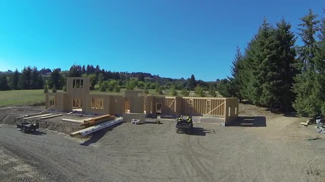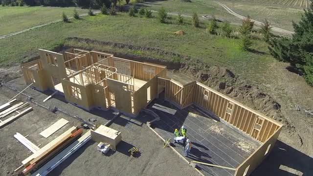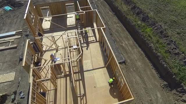Aerial shot of builders working on steel frame building with following vertical flight and construction site view. Moscow, Russia